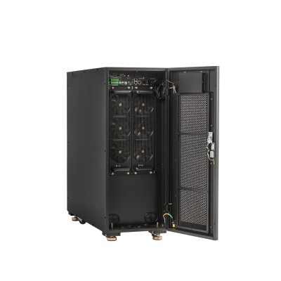Zasilacz modułowy COVER Online Double-Conversion, o mocy 60kVA/60kW. Obudowa wyposażona w moduły mocy HotSwap 2 x 30kW. Układ faz 3:3.